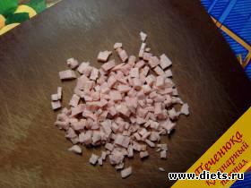 3) Ветчинную колбасу или рубленую ветчину нарезать мелкими кубиками, соединить с яичной смесью.