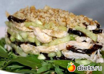 И снова выкладываем слоями: огурцы, куриное филе, немного чернослива, слой натертых яиц, поливаем 1-2 ст. ложками подсолнечного масла. Последний слой обильно посыпаем грецкими орехами.