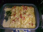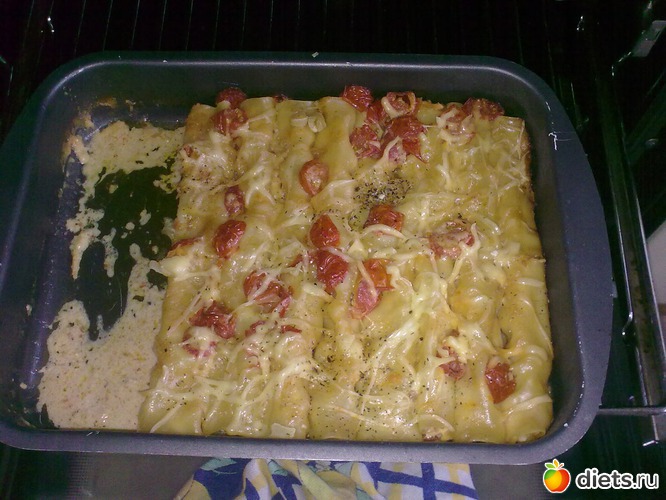 Укладываем каннеллони в форму, заливаем соусом, посыпаем тертым сыром, закрываем форму фольгой и отправляем в разогретую до 200 градусов духовку на 30 мин. Через 30 мин снимаем фольгу, посыпаем травкой и оставляем в духовке еще на 5 мин.