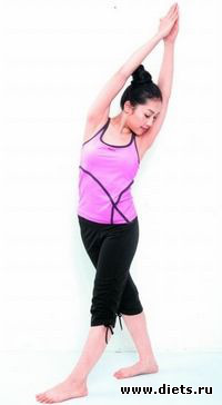 Продолжая держать руки над головой, выстави левую ногу вперед.