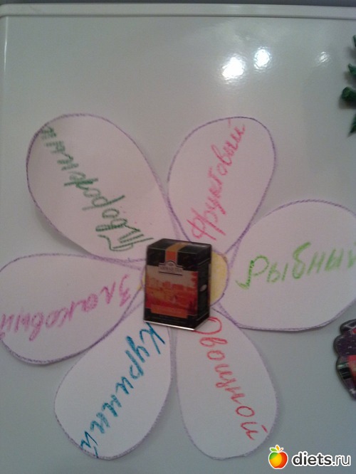 да и с последних сил далась мне тренировка, второй уровень шредов с Джиллиан Майклс. Завтра на овощах попытаюсь побыть. Уже и не обещаю. И конечно спорт. Висит у меня на холодильнике вот такая ромашка, а листики уже неделю не отлетают)))