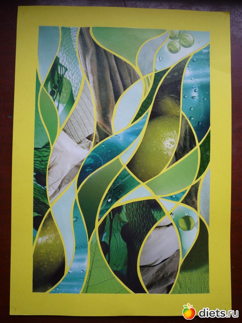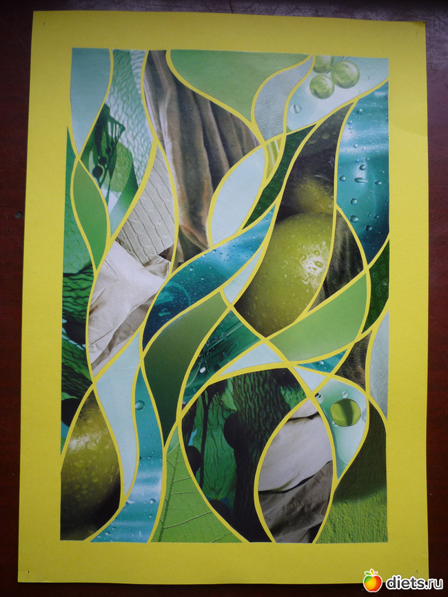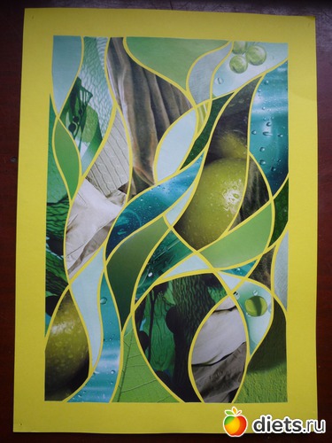 Зравствуйте. Хочу показать вам свою работу в технике коллаж, которая так и называется "Весна". Делалась она довольно давно и была началом серии "Времена года" (наполовину не доделанной, к сожалению). Сначала появилась картинка. Рисунок придумывался как для витража (разного размера кусочки, соединенные- спаянные фоновым цветом). Суть весны выражается в пластике линий и цвете кусочков, и то, и другое должно напоминать первую зелень и последние плачущие сосульки. Цветные кусочки вырезались из глянцевых журналов (самое сложное было найти картинки с зеленым и голубым цветом определенного размера).