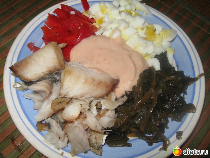 морская капуста, болгарский перец, яйцо, рыбка минтай отварная, в центре йогурт с горчицей и паприкой