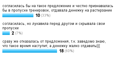 согласилась бы на такое предложение и честно признавалась бы в пропуске тренировок, отдавала денежку на растерзание