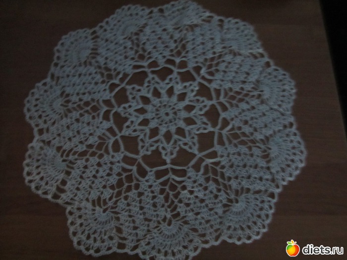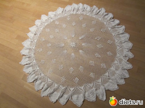 Женщины в нашей семье всегда имели тягу к рукоделию, моя бабушка прекрасно вышивала гладью, мама вяжет на спицах, в детстве я была обвязана с ног до головы, да и сейчас в шкафу висит черное вязаное платье-футляр, связанное мамой, которое я изредка надеваю и очень себе в нем нравлюсь. Это при том, что мне уже 32, а платье мама мне связала, когда я еще училась в университете, т.е. больше 10 лет назад, прямой облегающий фасон с воротником-стойкой будет актуален всегда. На фоне моих родных, мои успехи выглядят скромнее, но и тут есть чем похвалиться: пока ждала малыша, навязала ему кучу одежки, пинеток, шапочек, даже мужу "обломился" подарочек - тёпленький шарф... Но настоящей волшебницей в нашей семье по части рукоделия была и есть сестра моей мамы, моя тётя. Вещи, которые она создаёт - это просто шедевры. Нашу семью она обшила и обвязала уже полностью. Полюбуйтесь на скатерть, которую она мне подарила.