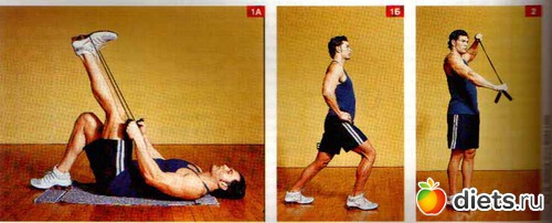 Лежа на спине, поднимите ногу, накиньте на пятку скакалку и осторожно потяните ногу на себя (1а). Затем встаньте, сделайте шаг назад, поставьте пятку на пол и чуть наклонитесь вперед (1б).