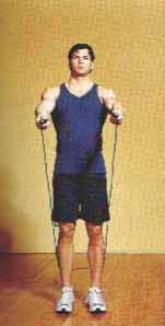 Встаньте прямо. Смотрите прямо перед собой. Руки чуть согните в локтях, кисти разведите в стороны на расстояние 15 – 20 см от бедер. Начинайте вращать скакалку
