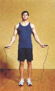 Скакалка находится сзади. Руки вытяните перед собой, чтобы полностью расправить скакалку.