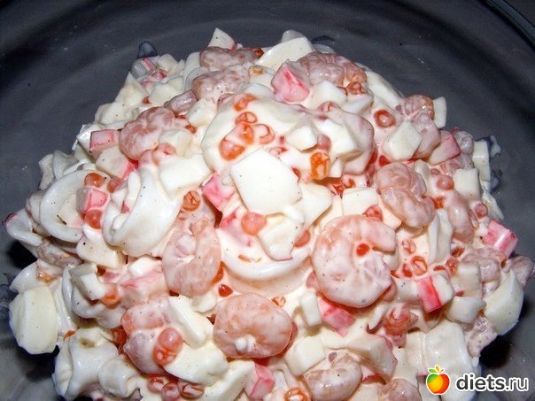 5. Теперь добавляем пару столовых ложек майонеза, перемешиваем, и только потом добавляем красную икру (чтобы не полопалась).