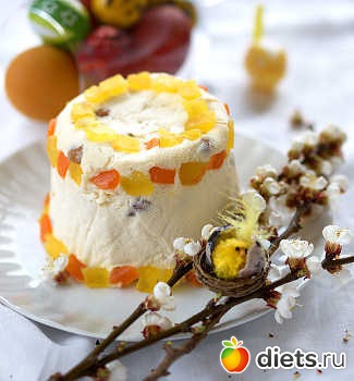 Для сервировки переверните форму с пасхой, снимите (или разберите) пасочницу. Украсьте поверхность пасхи отложенными цукатами.