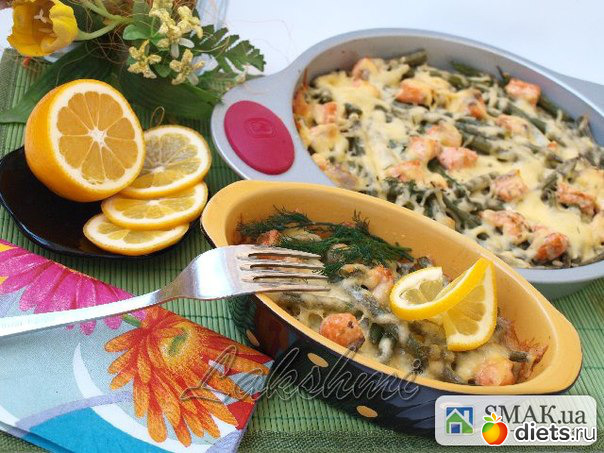 Филе сёмги нарезать небольшими кусочками. Посыпать сёмгу орегано, смесью перцев и сбрызнуть соком лимона. Оставить пропитаться. За это время отварить рис в подсоленной воде не разваривая. Обжарить сёмгу, не более трёх минут. К сёмге добавить не размораживая спаржевую фасоль. Посолить и поперчить по вкусу. Прогреть вместе на сковороде 2-3 минуты и выключить. В слегка остывший рис добавить белок, половину на тёртого твердого сыра и укроп. Хорошо перемешать. Формы смазать маслом, выложить рисовую смесь, сверху рыбу с фасолью. Посыпать оставшимся сыром и запечь в духовке при 180 градусах 15 минут, до зарумянивания сыра. Подавать с укропом и лимоном.