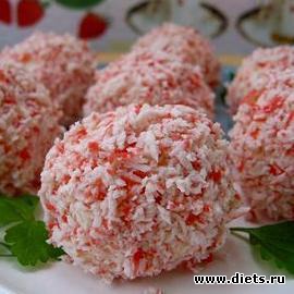 В России этот рецепт салата на скорую руку чуть упростили, и сейчас он популярен под названием «Рафаэлло». Вам потребуется три плавленых сырка, два зубчика чеснока, 2 вареных яйца, упаковка крабовых палочек (6шт). Палочки и яйца нужно мелко порезать, сырки и чеснок натереть в маленькую терку. И все! Смешайте половину крабового мяса с сыром, чесноком и яйцами, скатав из них шарики. Готовые шарики обваляйте в оставшихся крабовых палочках – и на стол. По мнению читательниц женских форумов на arabio.ru, этот салат является лучшим среди всех рецептов салатов на скорую руку.