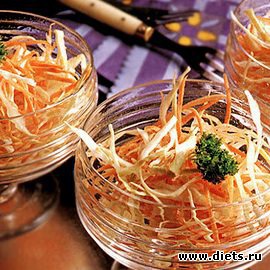 Готовить их быстро, и вкус отличный. Практически традиционным считаются салаты на скорую руку из капусты и моркови. Все, что нужно – 3 части капусты и одна часть моркови. Мелко шинкуем капусту, трем морковь. Но известный польский кулинар Злата Брегова советует улучшить качество этого салата на скорую руку за счет трех действий. Во-первых, нужно тщательно размять капусту, чтобы она дала сок, это очень важно. Во-вторых, когда мнете, добавить половинку чайной ложки сахара. В-третьих, сбрызнуть готовый салат уксусом и еще раз размять. Только потом добавляйте зеленый горошек, солите, заправляйте душистым подсолнечным маслом и подавайте к столу. Для колорита можете сверху положить пару лепестков лимона или ягоды брусники.