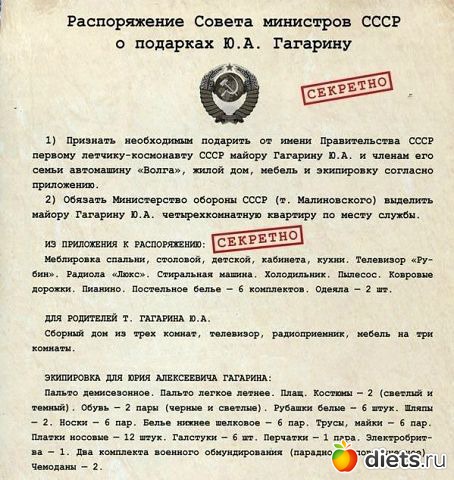 Diets.ru что получил Юрий Гагарин и его семья много лет назад.