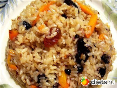 Раскалить казан или кастрюлю с толстым дном на сильном огне. Влить растительное масло.(я лила побольше чтобы обжарка была вся в масле) Всыпать нарезанный репчатый лук, жарить 2-3 минуты до полупрозрачности. Добавить морковь, я шинковала специальной формой для шинковки, получилась тонко нарезанная морковка и жарить до готовности моркови, помешивая. Посолить, поперчить, добавить шафран или смесь специй для плова.(кто не любит можно не добавлять) Выложить промытые сухофрукты (изюм, чернослив (порезаный)). Для любителей кураги её тоже можно добавить в плов. Всё перемешать.