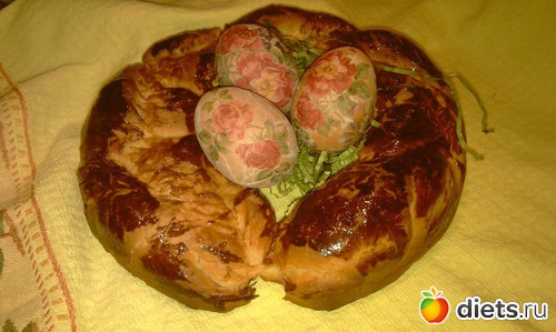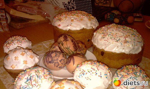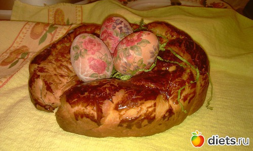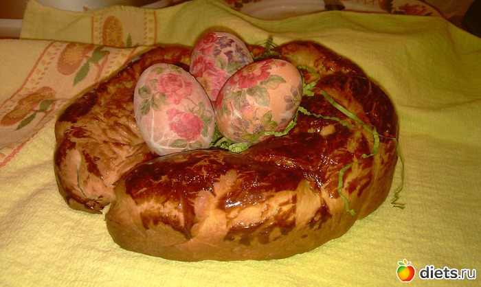 Понадобится 5 - 6 стаканов муки, 5-6 яиц, пакетик дрожжей "Саф-момент", 200 г сливочного масла, 1-1,5 стакана сахара, 1 стакан изюма, ванилин, тертый мускатный орех., можно добавить 1-2 ст.ложки коньяка, рома и т.д.