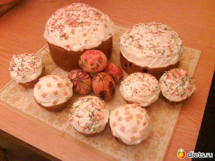 Дрожжи, теплое молоко и 2 стакана муки смешать, замесить и поставить в теплое место на 30-40 минут. А пока растопим и охладим масло, разотрем желтки с сахаром, взобьем белки. Соединим все это вместе, добавим ванилин или ванильный сахар и немного! (щепотку) соли, остальную муку. Все это добавим к уже подошедшему тесту с дрожжами и вымесим ручками как следует. Поставим тесто в теплое место на 2 часа (у меня стояло 1 час, но в разогретой до 50 град. духовке). Затем добавляем изюм, либо цукаты и раскладываем в формы, смазанные раст. маслом, на 1/3 объема формы. У меня получилось 3 средних и 6 маленьких куличиков из этого объема теста. Да. Тесто не должно быть жидким. Выпекала в духовке при темп. 180 град. 30-40 мин. Готовые куличи украсить.