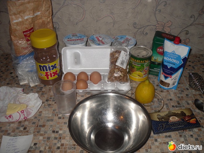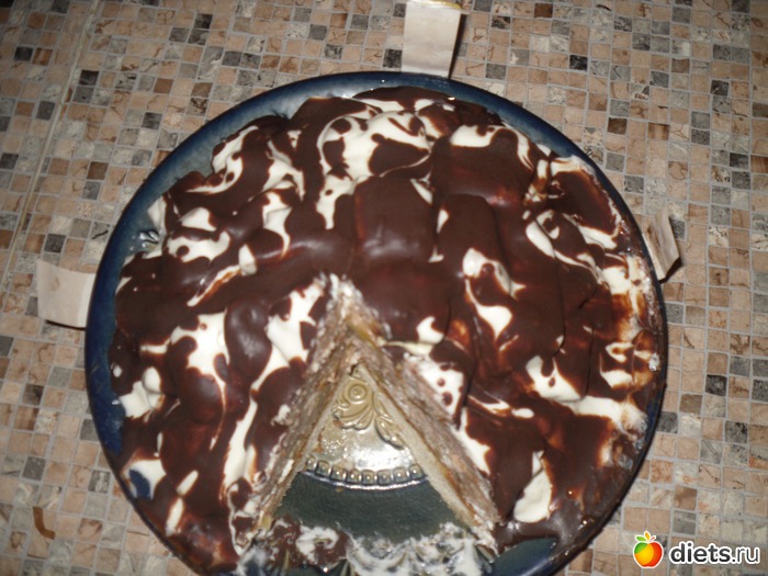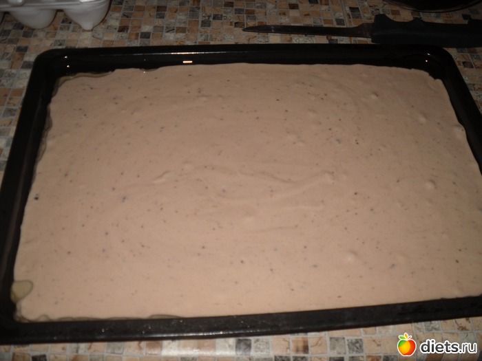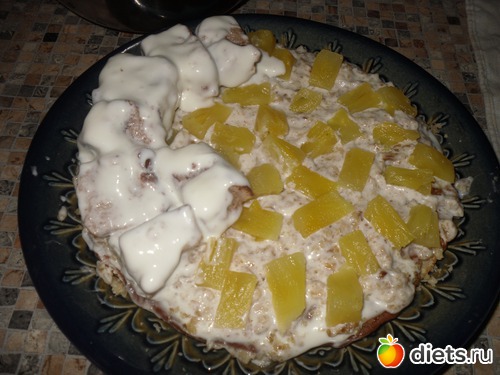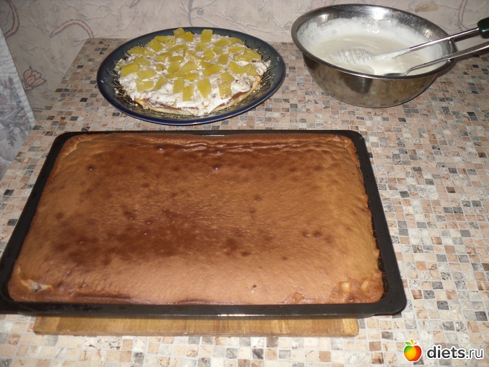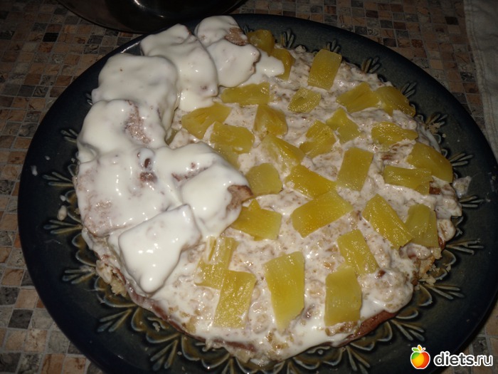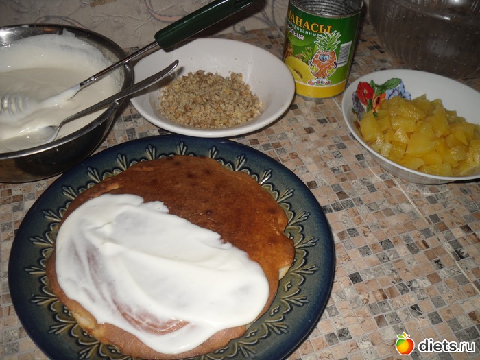 Кладем его на большую тарелку или блюда, что у вас есть. мажем кремом, поверх крема посыпаем орехами, поверх орехов выкладываем дольками ананасы, еще чуть чуть крема. Заем Корж из 2/3 теста (шоколадного цвета?