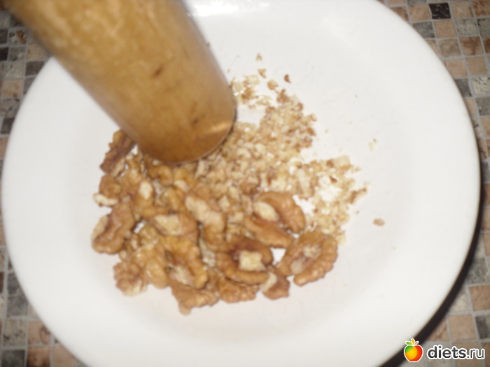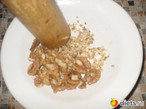 Если ананасы кольцами режем их на дольки маленькие. Грецкие орехи размельчить.