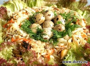Салат с курицей Гнездо Глухаря – настоящая кулинарная сказка, которая подается даже в самых шикарных ресторанах, при этом рецепт подобного салата из курицы весьма прост. Вам потребуется по полкило картофеля и курицы, 6 яиц, 3 головки лука, по вкусу майонез и зелень. Курицу сварите. Картофель для салата лучше фри, но если фритюрницы нет, просто тонко порежьте и обжарьте. Пока жарится, порежьте и замочите в уксусе лучок. Также нужно отварить яйца и вынуть желток, а белок мелко порезать. Курицу порежьте маленькими кусочками, смешайте с картошкой, белком яиц, посолите, заправьте майонезом и выложите на тарелку в форме круглого гнезда, на дно положите листья салата. Ну и какое же гнездо без яичек – разомните желтки с майонезом, скатайте из них яички и выложите на листья салата. Зелень – кинзу или петрушку, воткните так, чтобы она напоминала торчащий из гнезда птичий хвост. Получится прекрасный САЛАТ ИЗ КУРИЦЫ – и красивый, и очень вкусный.