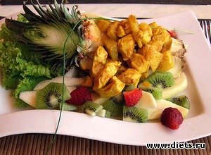 Салат из курицы с ананасами имеет множество поклонников благодаря очень удачному вкусовому сочетанию в салате этих двух компонентов - курицы и ананаса. Почему сочетание в салате курицы и ананасов получило такое название, неизвестно. Наверно, просто слово красивое. А готовить салат из курицы с ананасами его очень просто, рецепт такой – соедините в мелконарезанном виде полкило отварной курицы, 200 гр. ананасов и три вареных яйца, заправьте майонезом, украсьте зеленью. Если вы хотите изысков, можете добавить к курице 200 гр. обжаренных с лучком грибов, можно шампиньонов, вкус салата станет другой, мягче. Теми же грибочками или оливками можно украсить салат сверху. Я читала, что кто-то добавляет картошку, но картофель и ананасы – это уже дикая провинция, я себе такого не позволю.