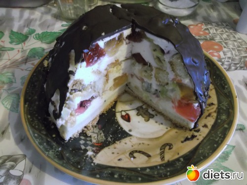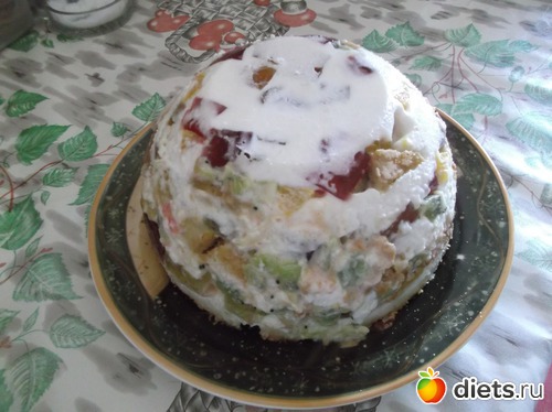 В глубокую миску на дно выложить немного сметано-желатиновой массы, потом фрукты(нарезанные кубиком) выкладывать вперемежку с кусочками бисквита и кусочками желе и т. д. - повторять слоями. Верхний слой Йогурта(сметаны), а на него, предварительно вырезанный по форме миски кусок бисквита ( он окажется потом внизу торта). Поставить в холодильник на 2-3 часа(а можно на ночь).