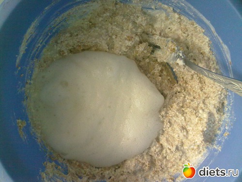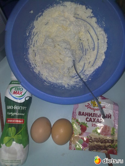 смешать творог, ванильный сахар, йогурт и яйца( желтки), и отруби