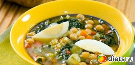 4. В готовый горох положите овощи, включая шпинат, лавровый лист, посолите, поперчите и варите до готовности картофеля.