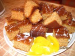 Остывший пирог разрезать на небольшие кусочки и полить сгущённым молоком.