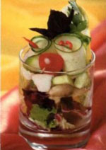 В креманки (можно в стеклянные стаканы) слоями выложить листья салата, грибы, огурцы, рыбу и болгарский перец, залить майонезом, смешанный с кетчупом(кетчуп по желанию) и измельченным чесночком. украсить (зеленью, долькой лимона, помидоркой черри)