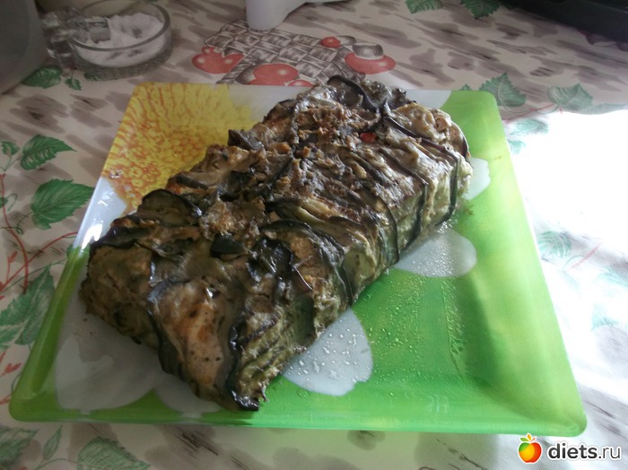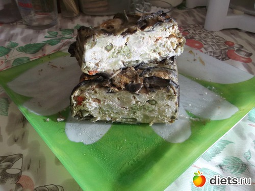 Форму(у меня как на хлеб кирпичиком) смазываем кисточкой с маслом, выкладываем ломтики баклажанов так, что бы прикрыть запеканку баклажанами со всех сторон, выкладываем начинку(хорошо перемешанную), прикрываем баклажанами всю запеканку, и ставим в хорошо разогретую духовку, выпекаем минут 40(при темпер. 180*), смотрим по верху запеканки. Я готовила для себя, поэтому не украшала, а Вы как хотите! ПРИЯТНОГО АППЕТИТА!