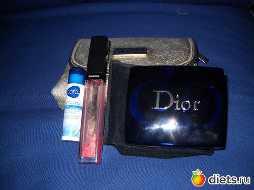 В косметичке маленькой у меня ссобой пудра Dior и блеск Chanel. Но чаще я просто пользуюсь увлажняющим бальзамом Эйвон.