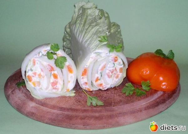 Китайскую капусту вымыть, отрезать донце. Положить кочан на разделочную доску и движением от себя раскатать его примерно до середины так, чтобы не нарушить порядок листьев. Сердцевину кочана удалить и использовать для приготовления других блюд. На край листьев выложить горкой сырную начинку.
