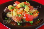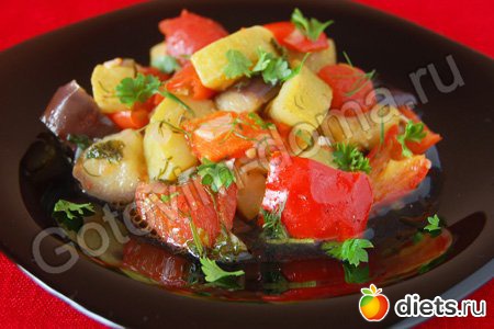 рататуй Берём:1 баклажан +1 кабачок+ 1перец красный и 1 жёлтый +1 морковку+1 луковицу ;всё режем кубиками и на сковородку слегка обжарить и залить томатным соком(что бы покрыть овощи) тушить 5-10 минут и к столу(вкусно как холодным так и горячем)
