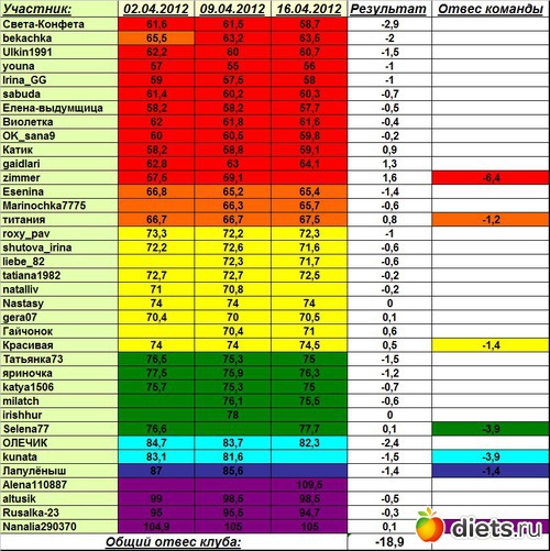 У всех команд минус! Первая тройка это Клубнички (красные) -6,4 кг, Изумрудики (зеленые) -3,9 кг и Голубушки (голубые) - 3,9 кг.