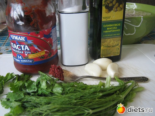 Для приготовления фасоли в бутылке понадобится: соль, красный жгучий перец, чеснок, масло оливковое, томатная паста, кинза, укроп.