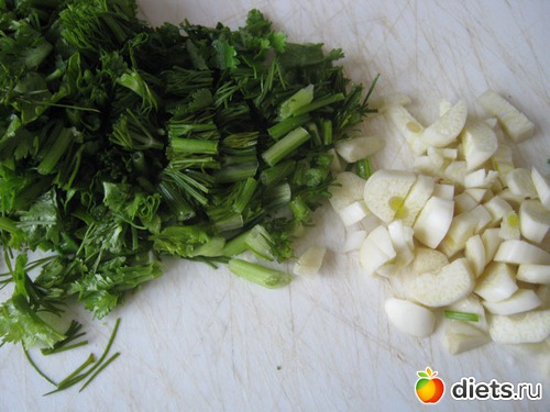 Зелень и чеснок мелко нарезаем.