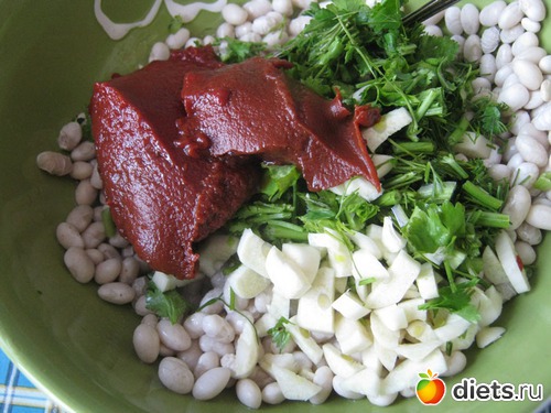 Смешиваем в тарелке фасоль, зелень, чеснок, добавляем красный жгучий перец, соль, растительное масло и томатную пасту (по желанию).