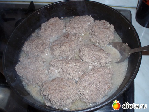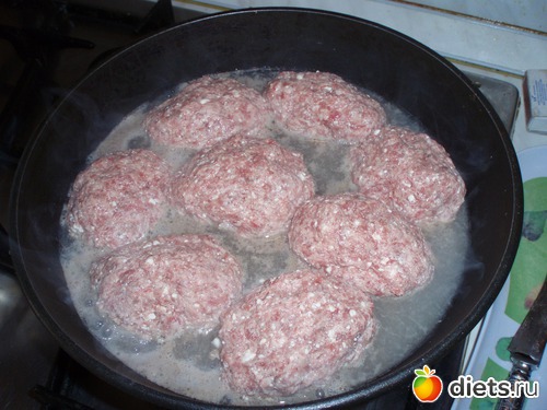 В сковородку налить немного воды, сформировать котлетки и положить в кипящую воду, снять пену