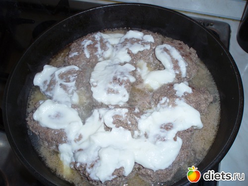 В сковородку налить немного воды, сформировать котлетки и положить в кипящую воду, снять пену