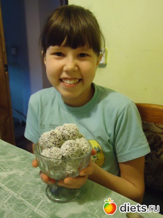 Да, ещё я делала половину конфеток обваленных а кокосовой стружке, а половину в кунжуте, так как мой муж и сын не любят кокосовую стружку и не едят с ней ничего! Так вот, и то и то очень вкусно!