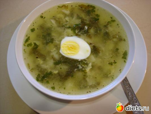 Это постный щавелевый суп, без мяса, и он выручает во время похудения, за счет своей низкой калорийности.