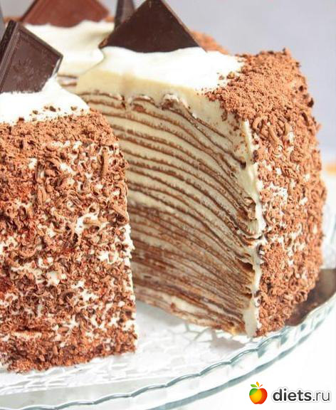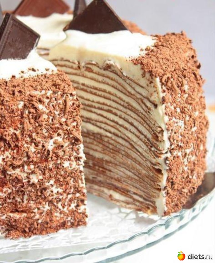 3. Переслоить блинчики тонким слоем крема, и поставить на ночь. Утром, обмазать блинчики оставшимся кремом и украсить шоколадом.