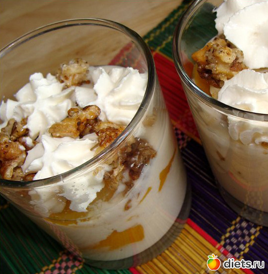 кондитерским шприцем отсадить на верх пудинга "розочки" и украсить орехами.