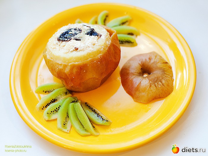Большое сладкое яблоко (у меня сорт Портрет). Срезаем шапочку. Вырезаем огрызок. Потом ещё скрябаем, чтобы сделать серединку побольше, а стенки не очень толстыми. Смешиваем 50 гр творога, 4 нарезанных черносливины и то, что выскребли из яблока, кроме огрызка.