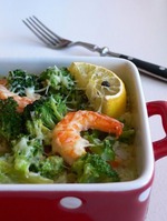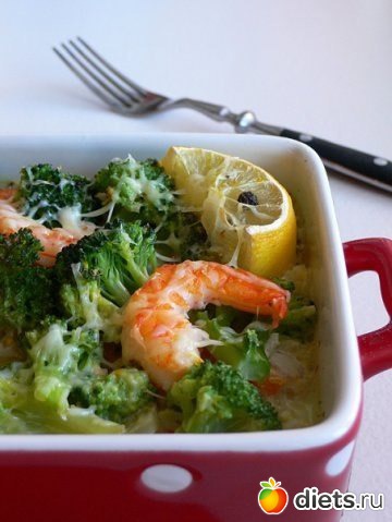 В форму для запекания слоями укладываем: рис, овощи, королевские креветки (приготовленные заранее). Посыпаем карри и перцем с лимонным ароматом, слегка поливаем лимонным соком.