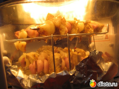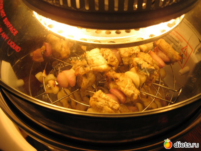 Нанизала рыбу с луком на металические шампура и в аэрогриль на решетки, добавила кольцо.