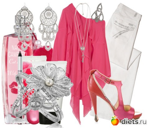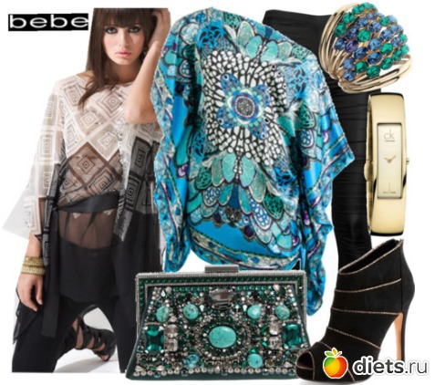 Туника темно-сиреневого цвета, которая охвачена поясом, создает впечатление платья, укороченного типа. Эффектно выглядит V-образный вырез на синей тунике с черными кругами на фоне выреза. Ее свободное сочетание с высокими сапогами и черным поясом создает сексуальный образ. Аналогичные варианты представлены и в красном и в белом цвете с темными кругами.