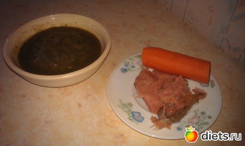 соленая горбуша, суп-пюре со шпинатом и морковка