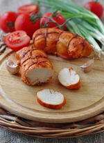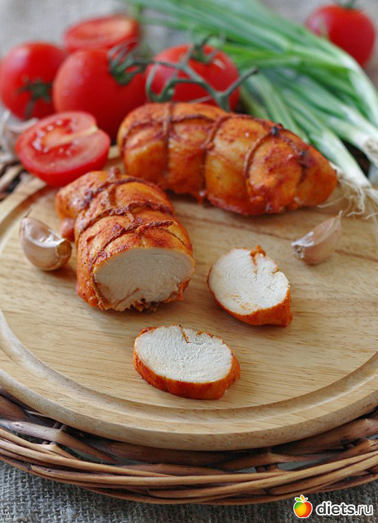 Возьмите 2 грудки по 200 гр. В стакане молока растворить соль. Грудки помыть под проточной водой и положить в миску. Налить в миску с куриными грудками молоко с солью, закрыть пленкой и убрать в холодильник на ночь. Смешать специи давленый чеснок, мёд, добавить соевый соус и оливковое масло. Этой смесью обмазать куриные грудки и оставить на 30 минут. После чего грудки плотно обвязать шпагатом.